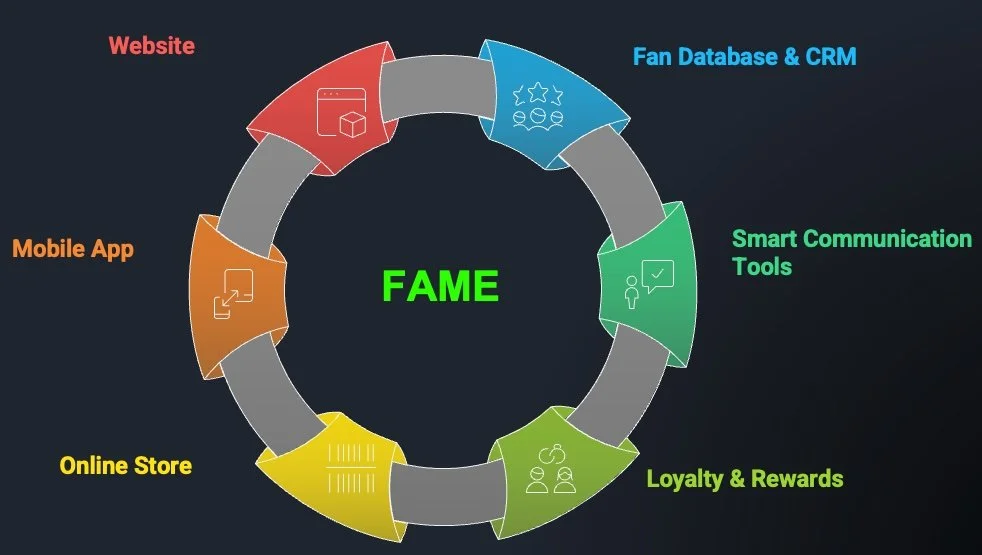FAME is a comprehensive Fan Experience ecosystem delivered as a monthly SaaS subscription, giving you a plug‑and‑play way to run modern, data‑driven fan engagement without building your own tech stack. It reframes raw reach into qualified attention, interactions and transactions, turning followers into engaged fans and engaged fans into measurable customers and revenue.